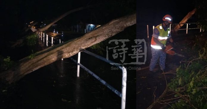 砂拉越北砂 倾盆大雨多处淹水 狂风刮倒3路树 2019年12月2日 (本报美里2日讯)大树不堪强风吹袭倒下,尚幸没有民宅受波及。Advertisement 昨晚8时许倾盆大雨,一直下到凌晨1时许,美里市许多地势较低及排水不良的地区因豪雨导致短暂性淹水。消防员亦因这场豪雨出勤展开清理工作。 消防局发言人表示,道路淹水情况在大雨过后就撤退,情况尚不严重。 由于豪雨时夹带强风,柏迈再也民宅附近的3棵美化树不堪强风吹袭倒下,其中1棵树身压在电讯局的电缆上,较后由消防员前往清理倒树,避免电讯服务受影响。 据了解,3棵倒树的树身粗大,尚幸没有民宅受波及。