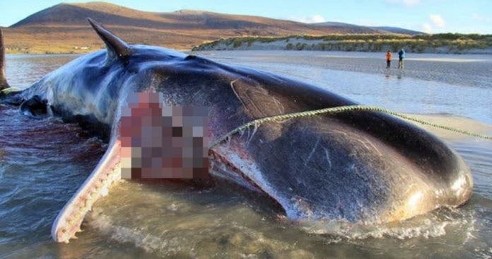 研究人员在苏格兰海滩解剖一头死亡的少年抹香鲸,在它胃里发现近100公斤的陆地与海洋垃圾,包括绳索、渔网与各类塑胶制品。