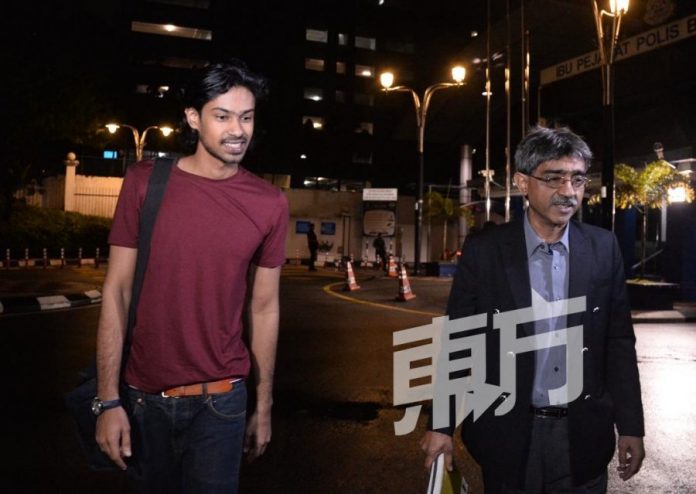 身穿红色T恤的尤索夫是于下午2时50分,与律师哈尼夫共乘黑色马赛地房车抵达武吉安曼警察总部,并在晚间8时41分,面带笑容地步出警察总部。