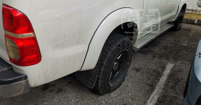 (本报诗巫22日讯)被怀疑藏毒而遭截停,男子拒让肃毒组警员搜查,强硬驾车离去时差点撞伤警员,警员为自保开枪打爆皮卡右侧前、后轮胎,男子最终驾着皮卡逃离现场。