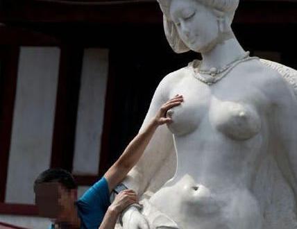 日前有游客攀站在雕像旁边,甚至抱着贵妃像的大腿、对贵妃像伸出「狼爪」袭胸等。