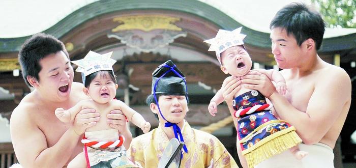 日本神奈川县一座神社,週二举行特別的「婴儿哭泣相扑」,由两名相扑选手各抱起一名婴儿,努力將婴儿弄到嚎啕大哭。今年约有110名一岁以下幼儿参加,比赛中最快放声大哭的婴孩最健康,即是冠军。这个拥有400年歷史的庆典源于一个谚语——「哭泣的婴儿长得最快」。日本人认为这会给孩子带来健康,孩子的尖叫声还能辟邪。