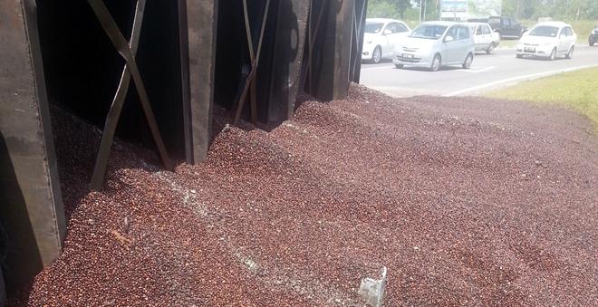 砂拉越中砂 大型罗里侧翻 1900吨油棕粒散满地 2015年5月7日 油棕粒散落一地。 (本报诗巫06日讯)载有近1900吨油棕粒的大型罗里,路过宏愿路交通岛时,疑车身侧倾斜,以致车体重心走位倾倒路面,而车斗内的油棕粒散落一地。Advertisement 罗里车身侧倒在路旁,引起路人注意。 意外发生之后,侧倾路上的罗里引起众人注意,随后而到的车辆小心奕奕经过肇事罗里旁。 据消息说,上述事故于今天早上9时30分发生,该辆罗里从兰岛邦章出发,载着满车斗的处理好的油棕粒。 该辆罗里原本计划把油棕粒载往宋溪美禄某个码头,以便转运出口到吉隆坡。
