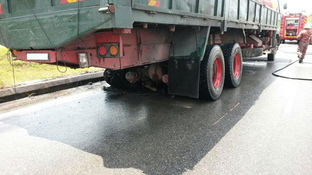 车祸后,骑士当场命赴黄泉。而该辆罗里的其中一个后轮也起火燃烧,冒出大量浓烟。