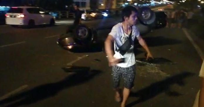 砂拉越南砂 车子失控四轮朝天 司机自行爬出来 2020年3月14日 (本报古晋14日讯)车子失控撞路中央路堤后撼倒美化树及撞翻数个大花盆,导致翻覆四轮朝天。Advertisement 司机幸仅虚惊无损伤,自行爬出肇祸车子坐路边休息时,1警用客货车途经停下,值勤的警察下车了解肇祸司机的情况及给予援助。 不料1辆随后而来的四驱车刹车不及的撞上有关警用客货车,所幸碰撞只造成车损毁无人挂彩。 上述意外事故是今日凌晨近2时发生在新邦迪卡架空大道上路段。