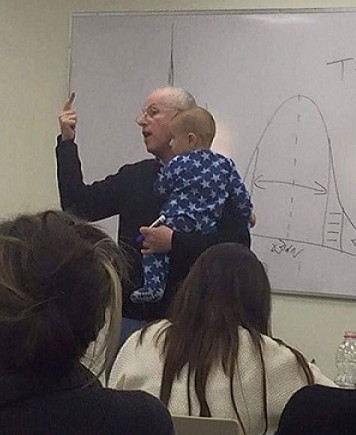 以色列耶路撒冷希伯来大学的一处课堂上,传来婴儿哭闹声,但课堂上的教授当场充当奶爸,哄宝宝乖乖,还直接继续教课。
