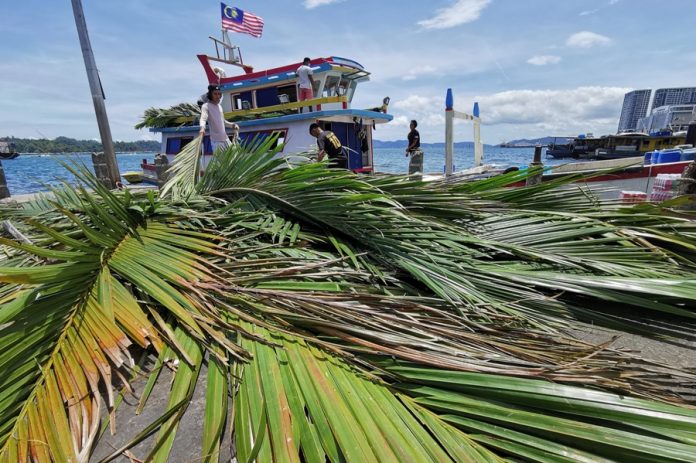 今早,亚庇中央鱼巴刹外堆放着亚答叶,过后由员工搬上停在岸边的一艘船,午间将出发到附近海域作业。