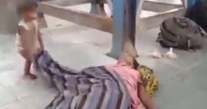 印度周一(25日)发生一起令人痛心的社会悲剧,路人拍到了一名男孩在穆扎夫法尔普尔(Muzaffarpur)的火车站,试图从倒地不起的妈妈身上拉开一条条纹长衣,浑然不知他年仅27岁的母亲,已经因为耐不住高温和饥饿交迫而死去。此事在印度社会引发广大争议,不少人批评政府失职,而面对谣传,死者家属也出面否认,她生前没有精神方面的疾病。