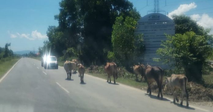 古达1日讯|达庇公路古打毛律区公路上经常可见成群黄牛横冲直撞,影响车辆通及威胁公路使用人的安全。