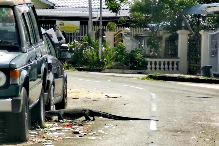 亚庇5日讯|一只长达6尺的四脚蛇,无畏地在路面爬行觅食,狗狗看了也避之不及远离。