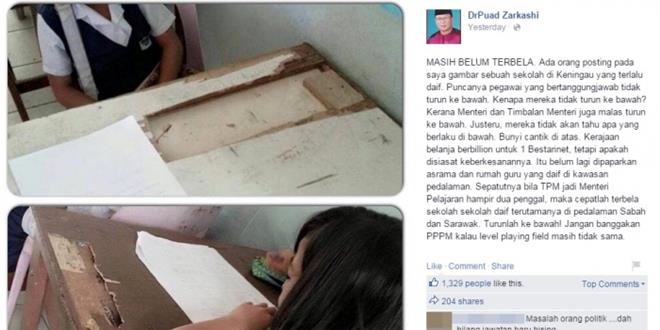 博安昨日在面子书上张贴根地咬一所学校的课室照片,显示学生使用破烂的桌子。他撰文表示:「造成这个的原因是,负责的官员没有视察学校的情况。为何他们没有下去视察?因为教育部长兼副首相也懒得下去。」