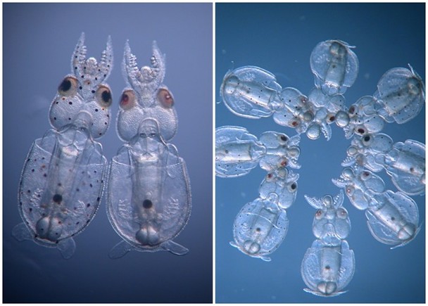 芝加哥大学附属海洋生物实验室高级科学家罗森塔尔(Joshua Rosenthal)和团队,以栖息于麻省伍兹霍尔(Woods Hole)的长鳍近海鱿鱼(Doryteuthis pealeii)为研究对象,透过CRISPR-Cas9技术去除鱿鱼胚胎中的色素沉着基因,消除其眼睛和皮肤细胞的色素,令孵出的小鱿鱼通体透明。