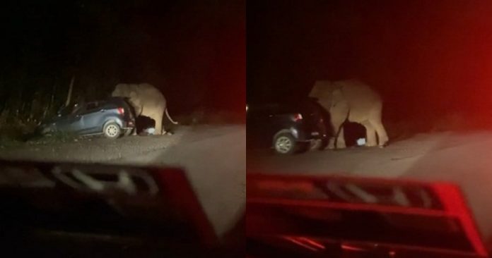 社交媒体今日流传一段相信是由公路使用者在夜晚所发布的视频中,可看到路旁有一头野象,正挨著一辆停驶而看似压毁的轿车旁,而象尾不断摆动,但是无法看到车内是否有人。