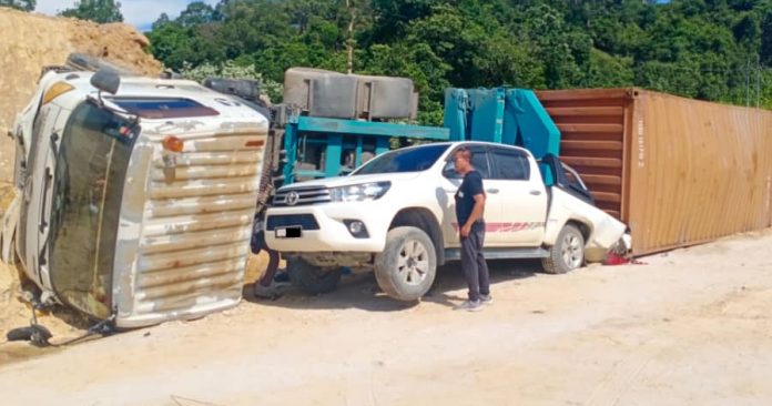 砂拉越北砂 疑失控侧翻酿祸 拖格罗里压毁皮卡 2020年8月14日 (本报美里14日讯)拖格罗厘行驶中失控并侧翻,不偏不倚碾压一辆停在路旁的皮卡。Advertisement 这起意外事故于今日上午11时许,在美民公路20余里路段处发生。 据了解,拖格罗里朝美里方向行驶,途经该路段处时,疑煞车器失灵导致失控冲向路旁泥坡后失平衡侧翻。 当时一辆皮卡恰巧停在泥坡旁,结果遭侧翻的拖格罗厘碾压,导致车子严重碾毁。 意外发生后,拖格罗厘司机轻微擦伤,至于皮卡司机则庆幸没在车内而逃过一劫。