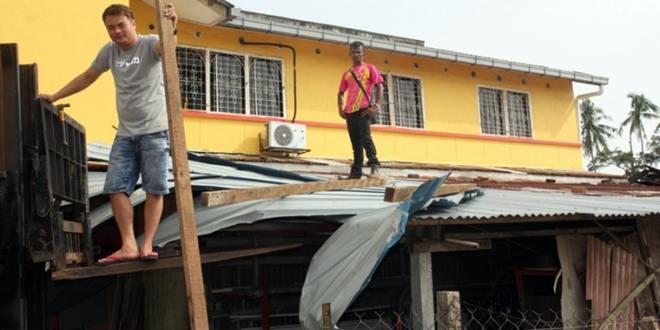 据悉,大风越维持10分钟左右,隨即下一场大雨,清晨雨势退去后,居民均忙於善后,包括修復被掀起的白锌片等。