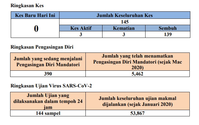 根据卫生部发布的文告,截至今日中午12时,汶莱累计的确诊病例保持在145宗,活跃病例3宗、痊愈病例139宗,死亡病例则维持3宗。