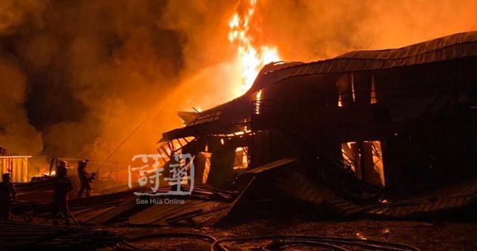 砂拉越南砂 朋岭工业区员工宿舍大火 2020年9月14日 (古晋14日讯)朋岭工业区一带今晚10时许发生火患,一排住有12户家庭的双层员工宿舍失火狂烧。Advertisement 猛烈火势一发不可收拾,整排宿舍瞬间陷入火海之中。 巴都林当、达闽再也和浮罗岸消防局均派出消防人员,赶赴火场参与灌救工作。 目前,近30名救火英雄在现场与大火搏斗。