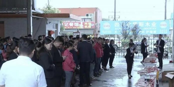 由片段可见,大批员工排队,前方桌面则摆满猪肉,每人都会获发一份猪腩肉和水果,而员工排队领取时均笑容满面。