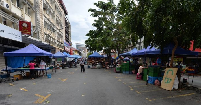 亚庇4日讯|加雅街周日市集在行管令后重开已恢复昔日情景当儿,近期新冠肺炎疫情再肆虐,导致今日市集只能开启第一排商店前摊位,共有27个摊位营业。