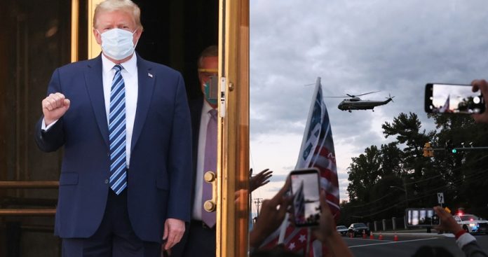 综合外电报导,特朗普于美东时间5日傍晚6点38分,从沃尔特里德国家军事医学中心向外踏出第一步。他对媒体挥手道谢,竖起大拇指并举拳头表示力量,现已搭乘直升机「陆战队一号」(Marine One)重返白宫,身上穿全套西装及佩戴口罩,并无其他防护,随行人员也未穿防护服。