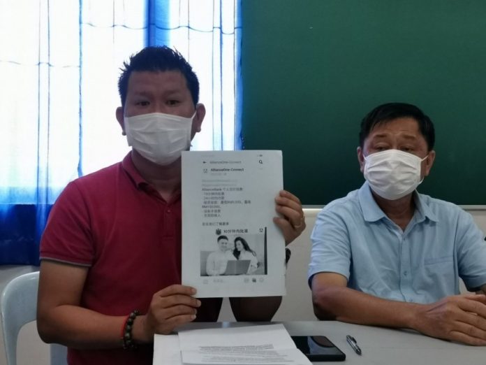黄锦来今日在马华丹绒比艾国会议员服务中心主任陈勇鸣陪同下,召开新闻发布会时,转述颜先生(41岁,技术人员)遭诈骗过程。