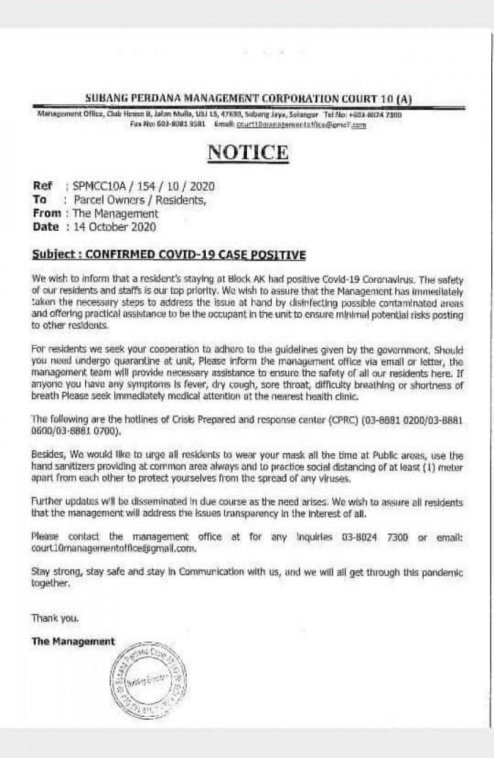 此外,斯里依登公寓的共管机构,同样于昨日发出确诊消息通告,但基于隐私权,因此不会公开确诊者的资料,也冀望其他居民勿泄漏确诊住户资料,或散播假消息。