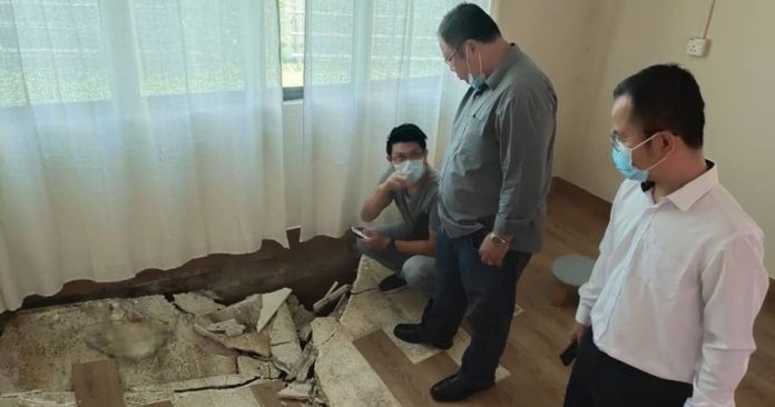 (亚庇28日讯)靠近和生园停车场工程的彭姓住户,由于和生园停车场工程初步施工,导致房屋下泥土流失从而客厅地陷。