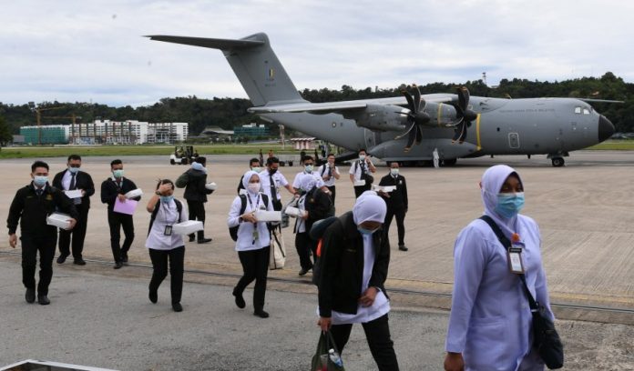 皇家空军A400型运输机载送野战医院医护人员以及医疗器材物资前往斗湖,助沙巴更有效地对抗疫情。