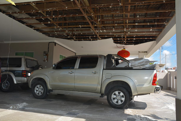 车房的大部份石膏天花板都破裂掉下地面,旁边也有一些石膏板出现破洞。