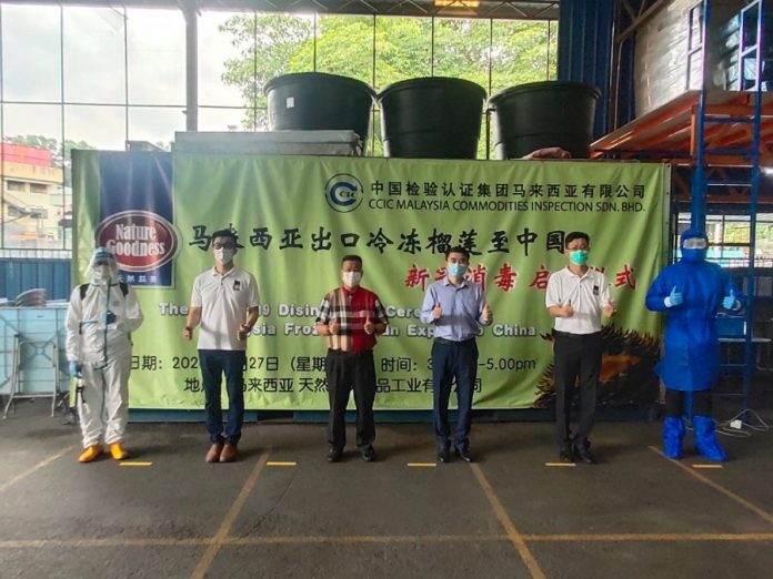 (吉隆坡27日讯)中国检验认证集团马来西亚有限公司今天对马来西亚天然益美食品工业有限公司出口中国的1250箱(共25吨)冷冻榴莲果泥和用于装货的40尺集装箱进行消毒,正式启动对马来西亚出口中国冷冻产品新冠病毒的消毒工作。这批冷冻产品将从马来西亚巴生港运往中国广州南沙港。
