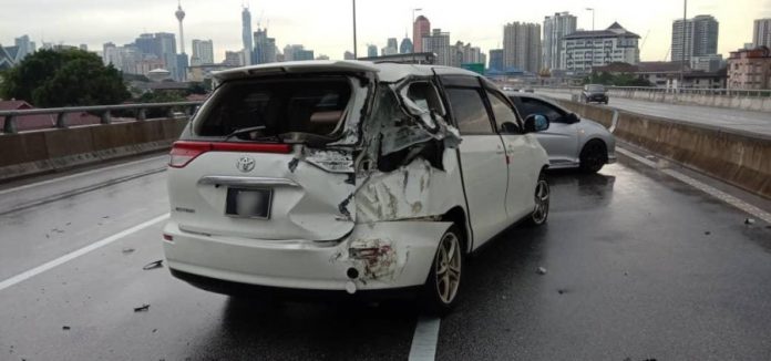 (吉隆坡1日讯)疑雨天路滑导致休旅车在高架天桥行驶时失控猛撞路墩,期间导致车内女童从车窗被抛飞到桥下!