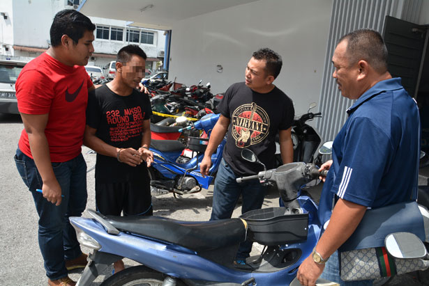 砂拉越中砂 骑贼赃摩托遭警埋伏 警扣查可疑夫妇 2015年6月6日 刑警向男嫌犯(左2)了解案情。 (本报诗巫5日讯)涉嫌偷取一辆摩托车,一名友族男子今早被警方扣查。Advertisement 今天上午9时,警方人员在华侨路一间超巿附近,发现一辆停放在那儿的摩托车十分可疑,就在那儿埋伏了2小时,直到11时终于看到一对男女出现,拿取这辆摩托车。 警方人员当场将这对是夫妻关系的男女捉住,并将男子扣上手铐,带回中央警署查办。 经过查证,发现该辆摩托车是于昨晚7时30分在中街失窃的。 因此,该名33岁的友族男嫌犯续被警方扣查,其妻子则在较后获得释放外出。