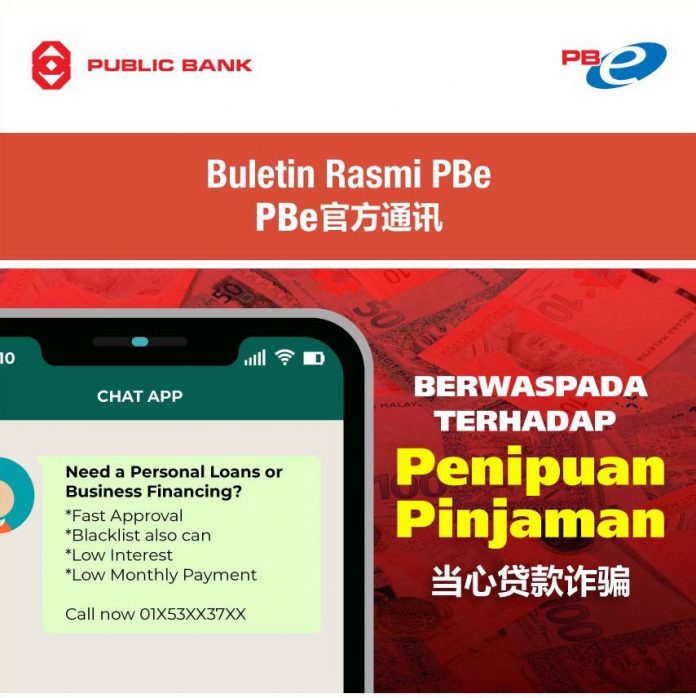 大众银行(Public Bank)发布文告提醒民众和用户,不要成为这些贷款诈骗的牺牲品。在接受任何贷款之前,请务必进行尽职调查。