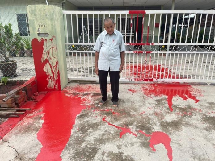 适耕庄民主行动党元老罗金荣今早7时打开家门,愕然发现前院,大门和两个门柱都被泼上红漆,并贴上了追债的警告字条,让他备感疑惑。