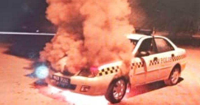 砂拉越中砂 巡逻途中冒烟失火 警车烧毁3人逃出生天 2020年12月28日 (诗巫28日讯)巡逻到一半突然失火,警车烧毁,车内3人员仓皇逃命!Advertisement 这起警车失火事件是今晚约9时,在南兰大桥附近发生。 当时,警车上共有3人,包括一名负责驾车的警员、一名军人及一名民防局人员。 据了解,警车的引擎突然冒烟着火,车内3人赶紧下车逃走,没人受伤。 消防员不久后到场扑灭火势。
