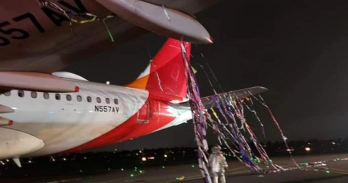 哥伦比亚航空公司一架A320班机,在当地时间12月31日晚间要从美国佛罗里达州奥兰多飞往哥伦比亚时,在空中撞击到一个飞行物体后被许多金属丝线缠绕。