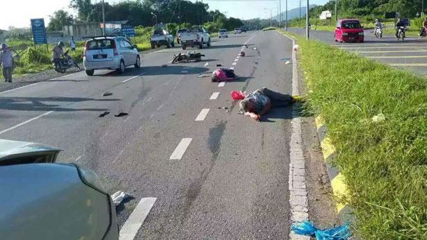 事发时,居住在大富村的伤者夫妇,如常地骑着摩托车朝向菜园方向前进,到24哩路段时,行走在快车道的他们被一辆疑是印尼注册的轿车猛撞。