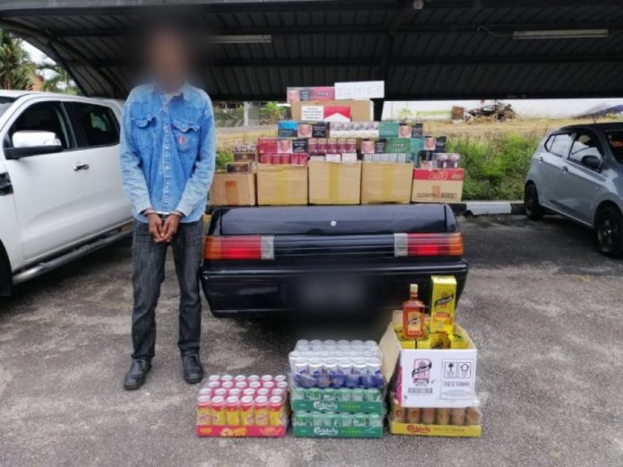 执法人员较后在该名男子驾驶的轿车内,搜出123箱各品牌走私香烟、5箱走私酒及7支走私烈酒,所有起获的走私品总值2万8000令吉。