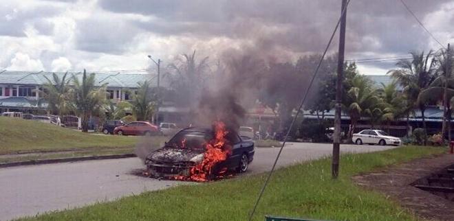 砂拉越中砂 车子着火 引擎烧毁 2015年6月14日 车子引擎起火燃烧。 (本报诗巫14日讯)行驶中的车子不知何故着火,消防员赶到现场灭火,车子的引擎已被烧毁。Advertisement 该辆车子于今午12时许驶经柏迈西路14巷路口时,司机见到前面防撞杆突然起火,大惊立即跳下车。 司机企图灭火不果,召来消防员,成功喷水灭火,唯前面引擎已被烧毁。 有关方面将调查着火原因。