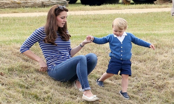 凯特今天一身休閒打扮,上半身穿蓝白条纹上衣,下半身穿牛仔裤,小王子则穿著蓝色羊毛衫和短裤。凯特一度带著儿子玩滑草,连同威廉王子,一家享受天伦乐,小王子也试著踢地上的白球。