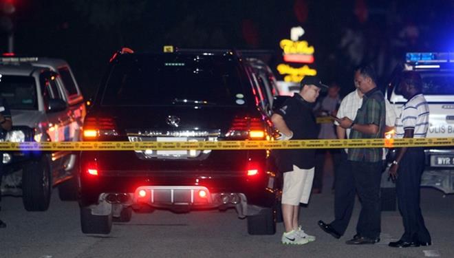 (八打灵再也15日讯)2名杀手今日下午趁下班繁忙时段,于万达镇朝一辆豪华四驱车连开8枪,试图枪杀一名拥有拿督名衔的沙巴华裔商人,詎料4枪落空,另4枪却击中商人身旁的蒙古籍女郎,商人因此逃过一命!