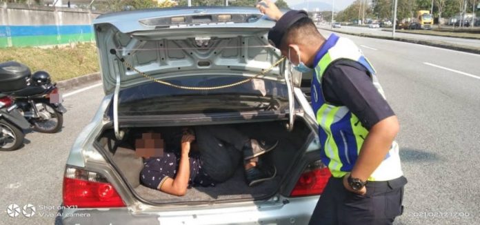 威中警区主任沙菲宜今日证实社交媒体流传有关一名男子被发现躲在车尾厢躲路障的案件,是在诗布朗再也北海居林大道第2.4公里的一个路障发生。