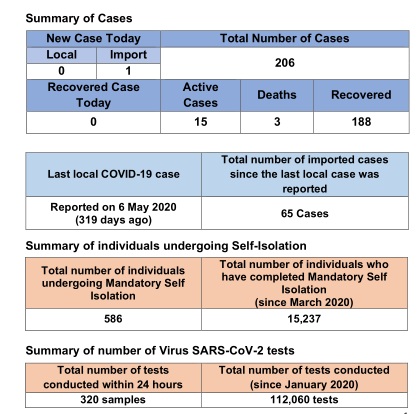 目前,该名病患正在国家隔离中心(NIC)接受监督及治疗。卫生部也为其2名接触者进行了拭子测试,结果均为阴性。 国家隔离中心目前所有活跃确诊病患均属情况稳定。