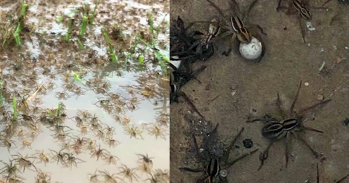 另一位居名肯普西(Kempsey)也在被水淹没的田里拍到成千上万蜘蛛浮出水面的画面,他说:「你能看到的所有的褐色都是蜘蛛在躲避洪水。」