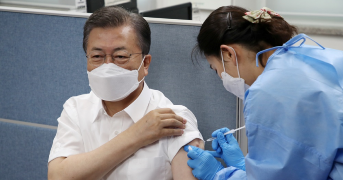 (首尔23日讯)韩国总统文在寅和夫人金正淑今日于首尔市钟路区卫生站,接种阿斯利康新冠疫苗。
