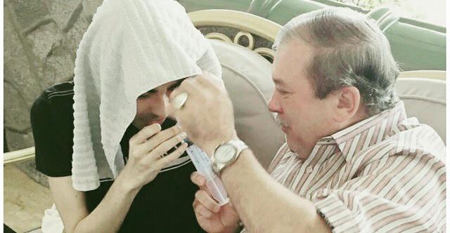 在三王子面子书上的照片可见,三王子头披著毛巾,而坐在一旁的殿下手则拿针筒,作势要替三王子从鼻子打针,之后父子俩还一同摆出有趣的姿势合照。