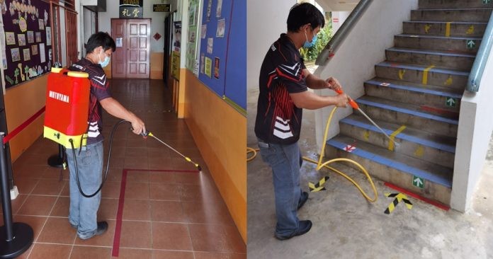 “消毒范围除了课室外,办公室、走廊、楼梯和厕所等都一一喷过安全的消毒剂,确保校园环境的安全。”