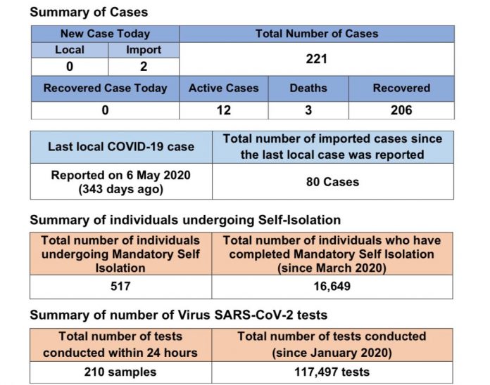 目前共有517人正在进行强制性自我隔离。去年3月至今已有16,649人完成了自我隔离。在过去的24小时内,当局共完成了210个样本检测,使实验室检测总数达到了117,497次。