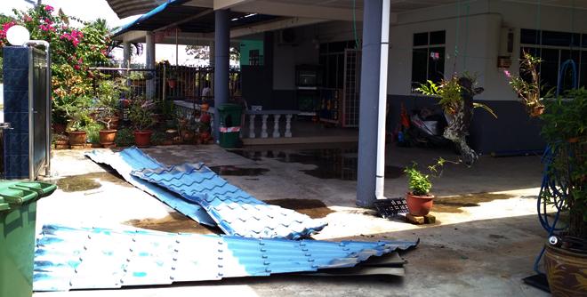 屋主姓张,接到讯息赶回家时,只见锌板屋顶及隔热板被卷走,有的挂在屋前的电线上,尚有的落在隔壁家的前院及旁边的空地上,也有落在对面马路上,屋前及水沟里。