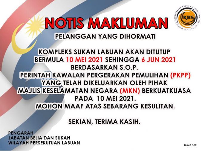 沙巴 闽综合体育中心 关闭至6月6 2021年5月12日 纳闽青年及体育局通告。 (纳闽12日讯)纳闽综合体育中心根据复原行管令的标准作业程序,从5月10日开始关闭至6月6日。Advertisement 纳闽青年及体育局在其脸书发布有关消息。 此决定乃是根据国家安全理事会于早前做出的宣布,并对所造成的不便表示歉意。